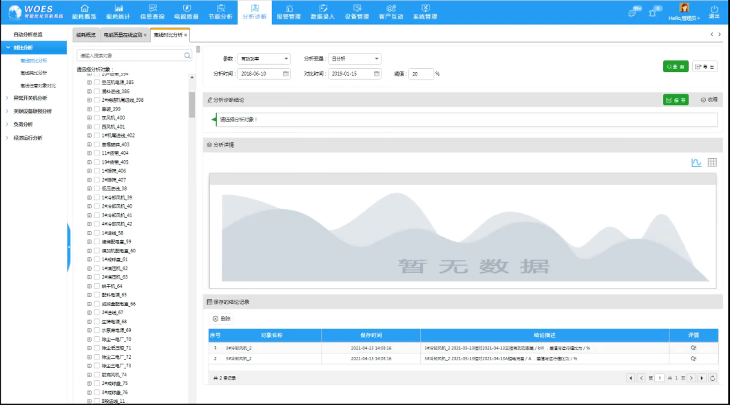 分析诊断模块包括对比分析、负荷分析、异常开关机分析以及关联设备联锁分析等子模块。分析诊断功能实现多角度全方位的在线分析,并提供相关的分析诊断策略,直接给出分析诊断的结论,为管理者调整用能提供依据。