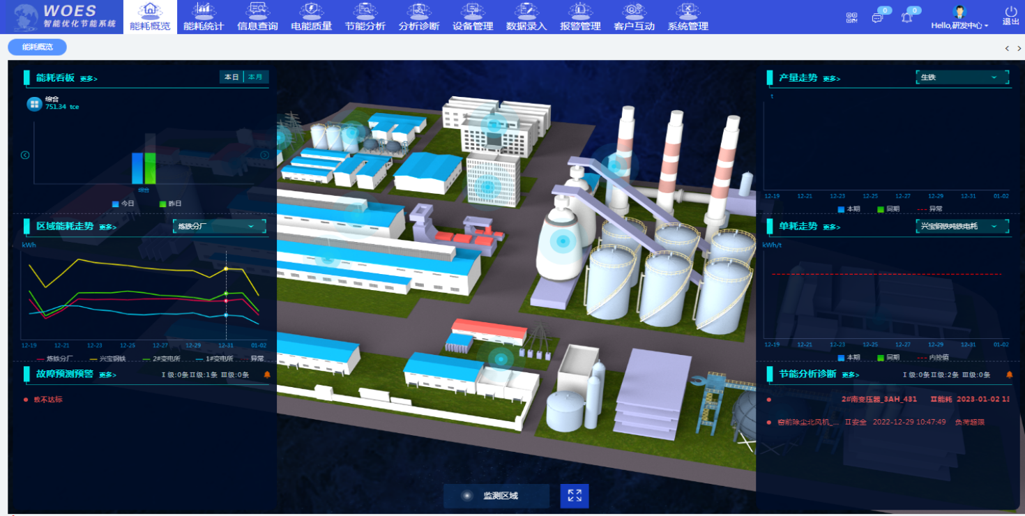 能耗概览按照该钢铁公司全厂区域的布置以鸟瞰俯视的方式展示当前能源消耗情况,同时可以按照能源使用、产量两个维度分别对炼钢厂、制氧厂、发电厂等分厂的产品日产量、月产量、年产量以及各个车间能源日用量、月用量、年用量进行展示;实现能效指标具体数值可视化,让管理者对每天的能耗情况实时的掌握,从而逐渐优化能源管理流程,建立客观的能源消耗评价体系,提高生产效率。