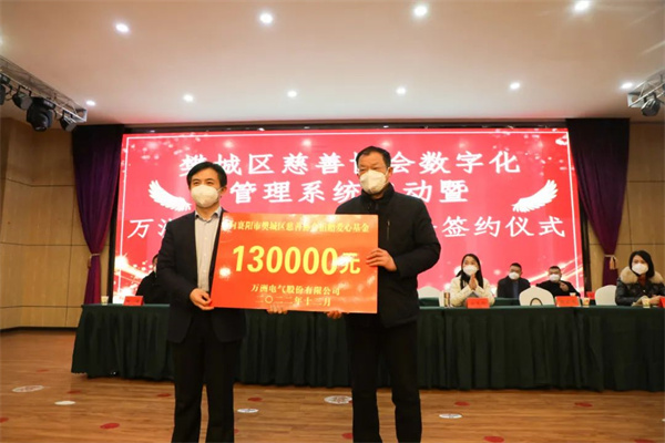 350vip浦京电气为樊城区慈善协会捐款13万元成立“350vip浦京电气公益基金”并获“慈善爱心单位”荣誉称号。350vip浦京电气董事长、总经理赵世运参加签约仪式。